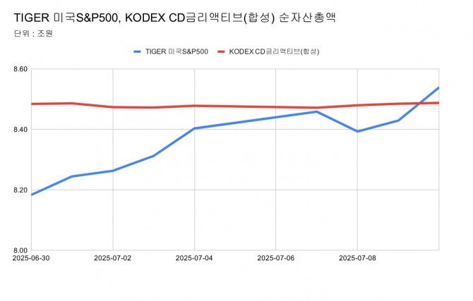 이미지 확대보기11일 한국거래소에 따르면, 지난 10일 기준 'TIGER 미국S&P500 ETF’는 순자산 총액은 8조 5,397억원을 기록해 삼성자산운용의 'KODEX CD금리액티브(합성)'를 517억원 차이로 눌렀다.