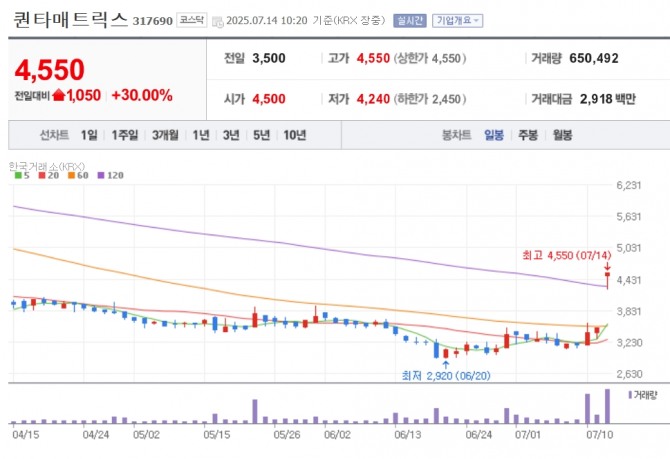 이미지 확대보기14일 한국거래소에 따르면 퀀타매트릭스는 이날 오전 10시 20분 현재 전 거래일 대비 30% 오른 4550원에 거래되고 있다.