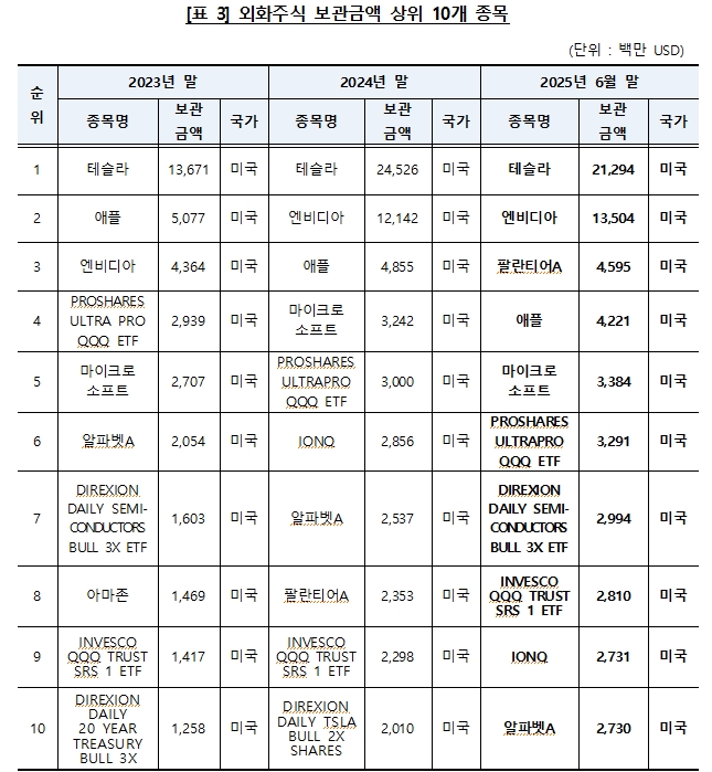 종목별로는 테슬라가 212억9400만 달러로 보관금액 1위를 차지하며 한국 투자자들의 '테슬라 사랑'을 다시 한 번 입증했다. 이어 엔비디아(135억400만 달러), 팔란티어 클래스A(45억9500만 달러), 애플(42억2100만 달러), 마이크로소프트(33억8400만 달러) 순으로 나타났다.