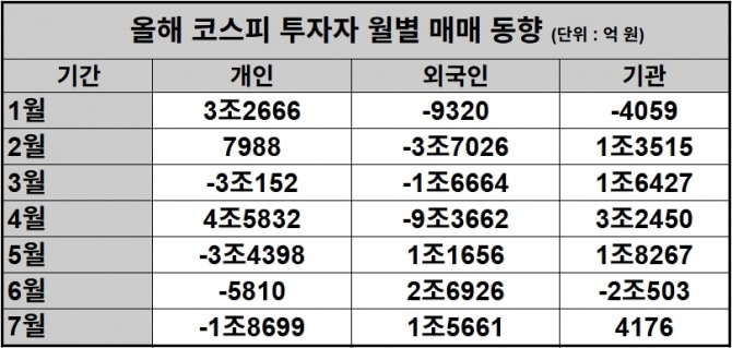 이 같은 흐름은 올해 초부터 지속돼왔다. 외국인은 1월부터 6월까지 매월 엇갈린 수급을 보이다 5월과 7월에 큰 폭의 순매수를 보였다. 특히 4월에는 -9조3662억 원으로 올해 최대 월간 순매도를 기록한 뒤, 5월부터 분위기가 반전됐다. 당시 미국 기준금리 인하 지연과 중동 리스크가 복합적으로 작용하면서 외국인의 위험 회피 심리가 강해졌지만, 반도체 업종 중심으로 수급이 돌아오며 방향이 다시 바뀌었다.