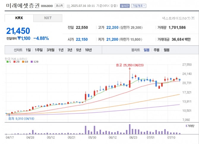 이미지 확대보기16일 한국거래소에 따르면 미래에셋증권은 오전 10시 11분 현재 전 거래일보다 4.88% 내린 2만1450원에 거래되고 있다. NH투자증권은 3.41% 내린 2만2650원에, 삼성증권은 2.76% 내린 7만7500원에 거래 중이다.