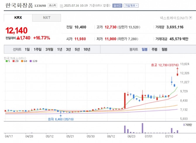 이미지 확대보기16일 한국거래소에 따르면 이날 오전 10시 19분 현재 한국화장품은 전 거래일 대비 16.73% 오른 1만2140원에 거래되고 있다. 장중에는 1만2730원까지 치솟아 52주 신고가를 경신했다.