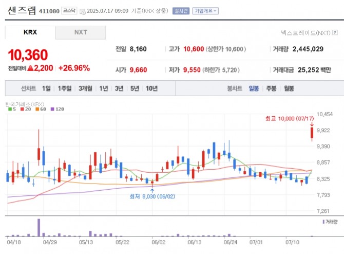 17일 한국거래소에 따르면 오전 9시 09분 현재 샌즈랩은 전 거래일 대비 26.96% 급등하고 있다.