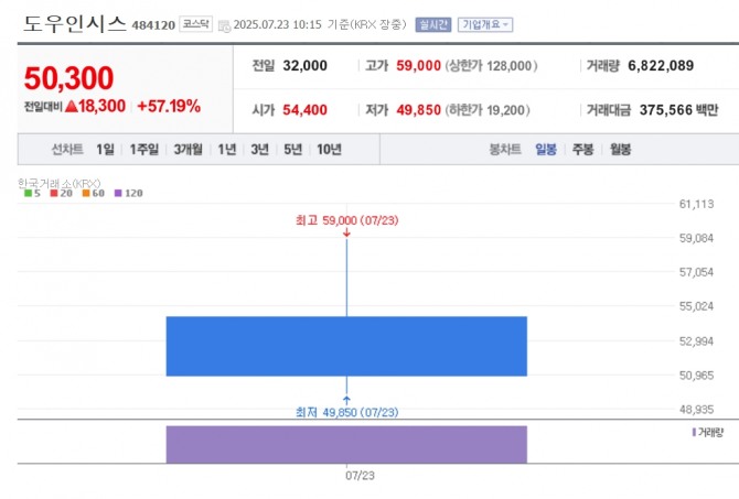 23일 한국거래소에 따르면 이날 오전 10시15분 현재 도우인시스는 공모가(3만 2000원) 대비 57.19% 오른 5만 300원에 거래 중이다.