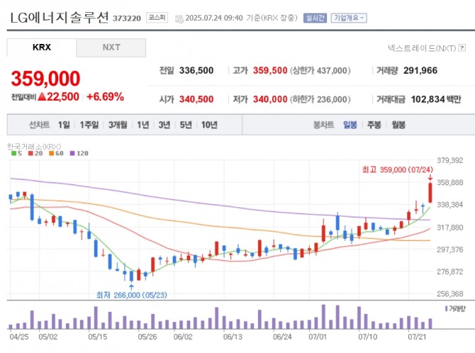 이미지 확대보기24일 한국거래소에 따르면 이날 오전 9시40분 현재 LG에너지솔루션은 전거래일 대비 6.69% 오른 35만9000원에 거래 중이다.
