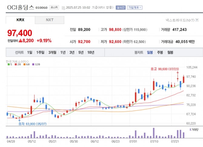 이미지 확대보기25일 한국거래소에 따르면 이날 오전 10시02분 현재 OCI홀딩스는 전거래일 대비 9.19% 오른 9만 7400원에 거래 중이다.