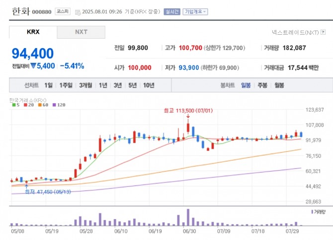 이미지 확대보기1일 한국거래소에 따르면 오전 9시 26분 한화 주가는 전일 대비 5.41% 감소한 9만4400원을 기록하고 있다. 이외에도 코오롱(-5.38%), CJ(-3.67%), 두산(-3.99%), HS효성(-3.70%) 등이 3% 이상 하락세를 기록하고 있다.
