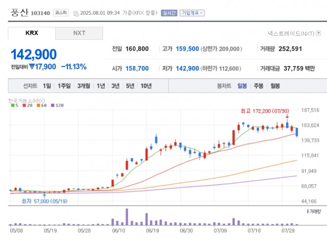 이미지 확대보기1일 한국거래소에 따르면 오전 9시 34분 현재 풍산은 전 거래일 대비 11.13% 하락한 14만 2900원에 거래되고 있다.