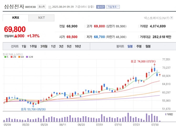 이미지 확대보기4일 한국거래소에 따르면 이날 오전 9시 39분 현재 삼성전자는 전 거래일 대비 1.31% 오른 6만 9800원에 거래되고 있다. 미국의 기준금리 인하 기대 후퇴, 국내 세제 개편안에 대한 실망 등에 코스피가 3.88% 급락한 지난 1일 하루 삼성전자는 3.50% 내려 6만 8900원까지 밀렸다.