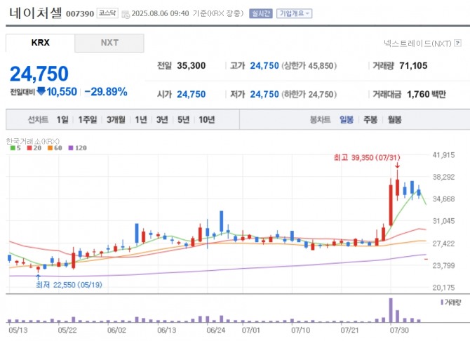 이미지 확대보기6일 한국거래소에 따르면 오전 9시 40분 현재 네이처셀은 전 거래일 대비 29.89% 하락한 2만 4750원에 거래되고 있다.