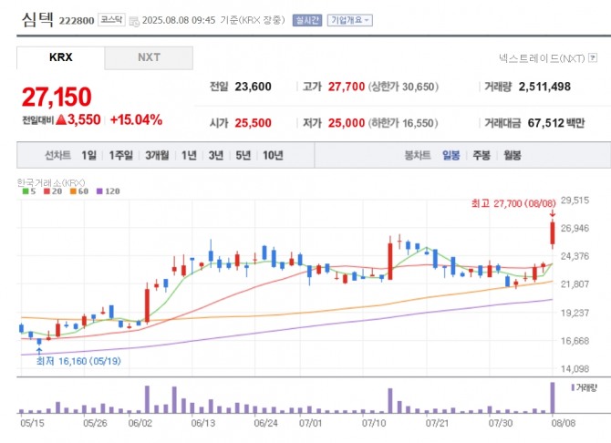 이미지 확대보기8일 한국거래소에 따르면 심텍은 오전 9시 45분 기준으로 전 거래일 대비 15.04% 오른 2만 7150원에 거래되고 있다.