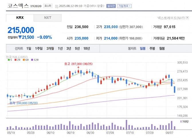 이미지 확대보기12일 한국거래소에 따르면 오전 9시 10분 코스맥스의 주가는 전일대비 9.09% 빠진 21만5000원에 거래되고 있다. 3거래일 연속 하락세다.