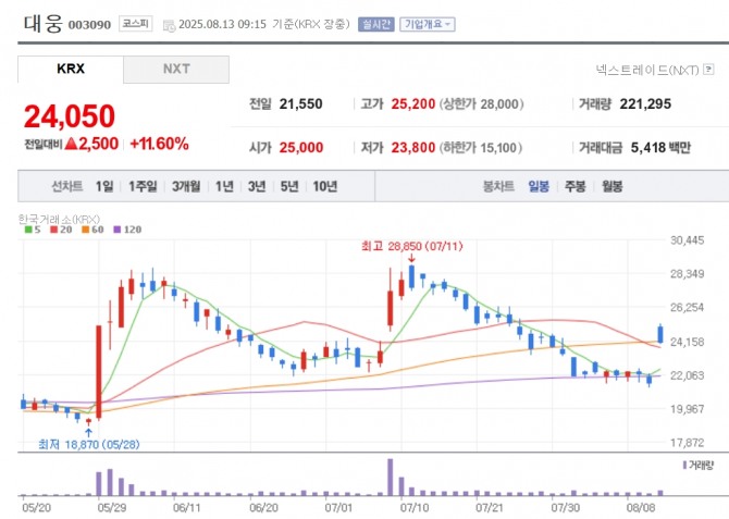 이미지 확대보기13일 한국거래소에 따르면 대웅은 이날 오전 9시 15분 기준 전 거래일 대비 11.60% 오른 2만 4050원에 거래되고 있다. 대웅제약 역시 2.71% 오른 13만 2800원에 거래 중이다.