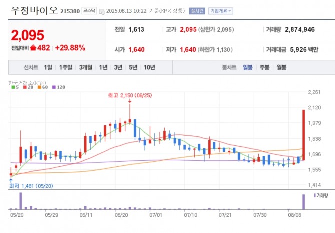 이미지 확대보기13일 한국거래소에 따르면 오전 10시 22분 기준 우정바이오는 전 거래일 대비 29.88% 오른 2095원에 거래되며 상한가를 기록했다. 같은 시각 인바이오젠(24.95%), 수젠텍(16.99%) 등 진단키트 관련주도 상승세다.