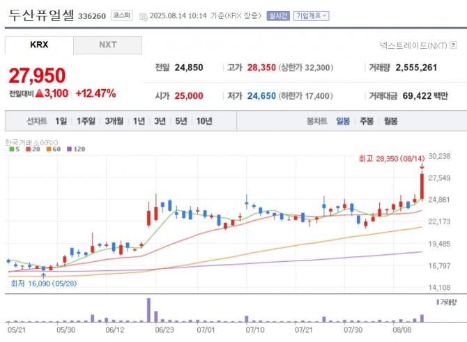14일 한국거래소는 오전 10시14분 기준 두산퓨얼셀은 전 거래일 대비12.27% 오른 2만7950원에 거래되고 있다. 장중 2만8350원까지 오르며 52주 신고가를 경신하기도 했다.