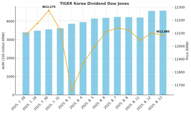 14일 글로벌이코노믹이 집계한 바에 따르면, 이달 5일 4000억원을 처음 돌파한 ‘TIGER 코리아배당다우존스 ETF’의 순자산은 13일 현재 4,576억원까지 몸집이 커졌다.
