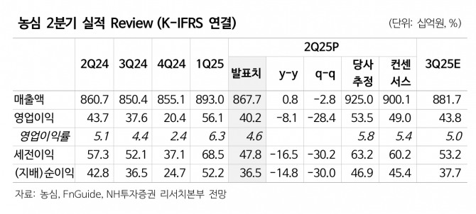 이미지 확대보기농심의 2분기 연결기준 매출액은 8677억원으로 전년 대비 1% 늘고, 영업이익은 402억원으로 전년 대비 8% 줄어든 것으로 집계됐다. 영업이익 기준 컨센서스를 하회했다.