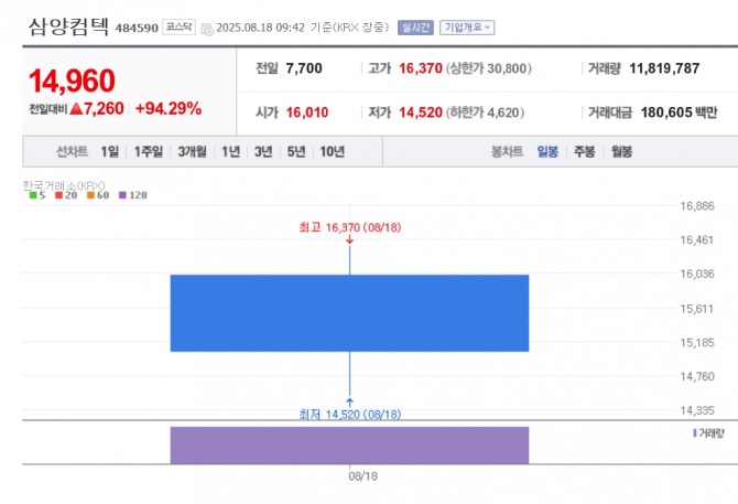이미지 확대보기18일 한국거래소에 따르면, 삼양컴텍은 오전 9시 42분 기준으로 공모가 대비 94.29% 오른 1만 4960원에 거래되고 있다.
