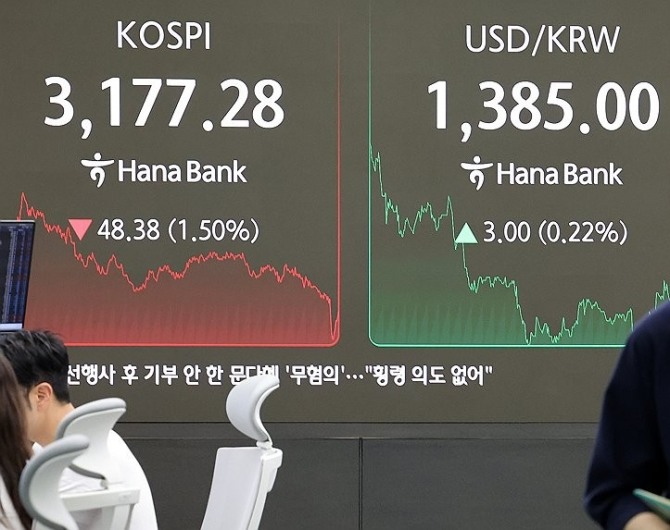 이미지 확대보기이날 한국거래소에 따르면 코스피지수는 전 거래일 보다 1.50%(48.38포인트) 내린 3177.28에 거래를 마감했다.