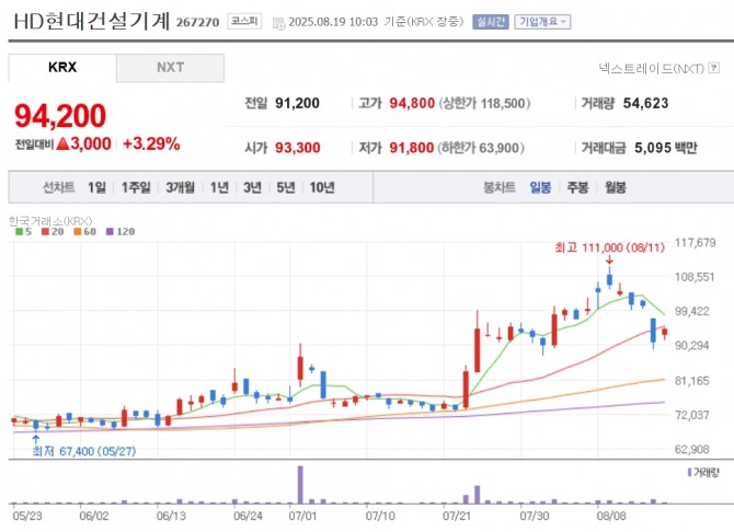 이미지 확대보기19일 한국거래소에 따르면 오전 10시 03분 기준 HD현대건설기계는 전일보다 3.29% 오른 9만4200원에 거래되고 있다.
