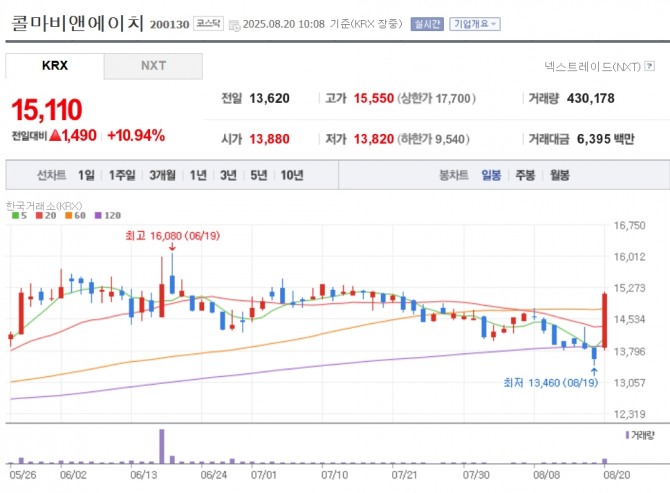 이미지 확대보기20일 한국거래소에 따르면 오전 10시 08분 코스닥 시장에서 콜마비앤에이치는 전장 대비 10.94% 오른 1만5110원에 거래되고 있다.
