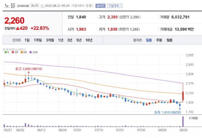 이미지 확대보기21일 한국거래소에 따르면 노을은 오전 9시 24분 기준으로 전 거래일 대비 22.83% 오른 2260원에 거래되고 있다.