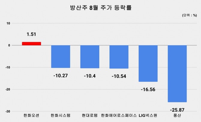 이미지 확대보기25일 한국거래소에 따르면 7월 말 대비 지난 22일까지 방산 주요 종목들이 두 자릿수 하락률을 기록하는 등 부진한 흐름을 나타냈다. 풍산이 –25.9%로 낙폭이 가장 컸고, LIG넥스원(–16.56%), 한화에어로스페이스(–10.54%), 현대로템(-10.40%), 한화시스템(–10.27%) 등이 뒤를 이었다. 주요종목 시가총액 변동을 보면 8월에만 12조5000억 원 가량이 증발했다.