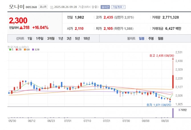 이미지 확대보기26일 한국거래소에 따르면 모나미 주식은 오전 9시 28분 코스피시장에서 전일보다 16.04% 오른 2300원에 거래되고 있다. 장 초반 2435원까지 오르며 20%대 주가 상승률을 나타내기도 했다.