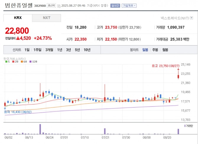이미지 확대보기27일 한국거래소에 따르면 이날 오전 9시 46분 현재 범한퓨얼셀은 전장 대비 24.73% 오른 2만1800원에 거래 중이다. 범한퓨얼셀은 개장 직후 급등해 상한가를 나타내기도 했다.