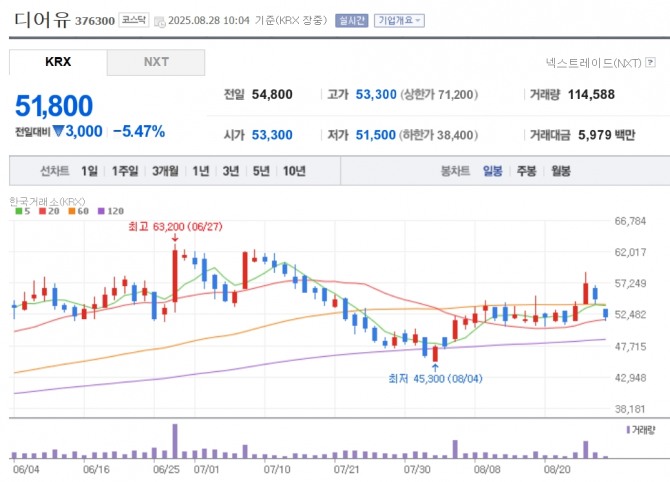 이미지 확대보기28일 한국거래소에 따르면 오전 9시24분 기준 디어유는 전 거래일 대비 5.47% 하락한 5만1800원에 거래됐다. 삼화네트웍스(-3.68%), 큐브엔터(-2.76%), 노머스(-2.73%), JYP Ent.(-2.66%), 빌리언스(-2.60%), 하이브(-2.54%), CJ ENM(-2.50%) 등도 약세를 보이고 있다.