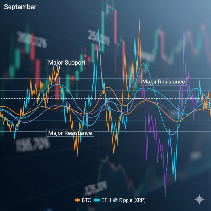 장기적으로는 강세장이 예상되지만, 단기적으로는 BTC와 ETH가 주요 저항선을 돌파하는 데 어려움을 겪고 있고 XRP는 좁은 박스권에 갇혀 있어 9월 시장에 대한 관심이 집중됐다. 과연 이달이 결정적인 돌파구가 될지, 아니면 더 큰 조정을 초래할지 주요 암호화폐의 기술적 전망을 분석했다.