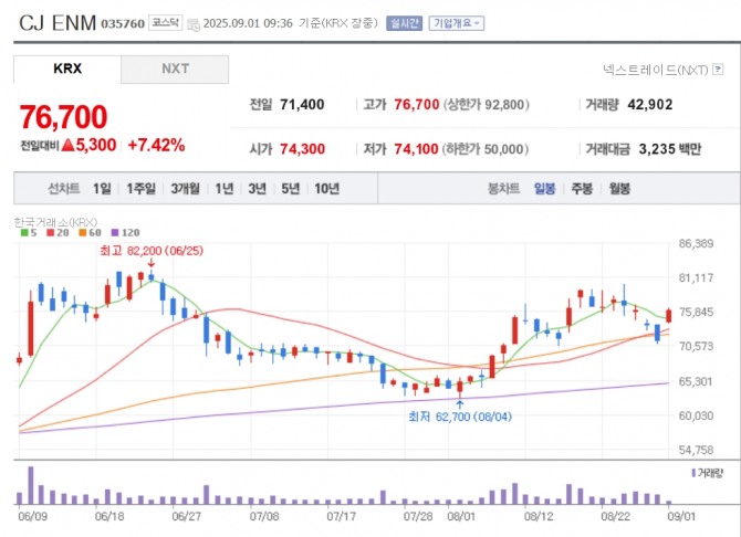 이미지 확대보기1일 한국거래소에 따르면 CJ ENM은 이날 오전 9시 36분 현재 전 거래일 대비 7.42% 오른 7만 6700원에 거래되고 있다.