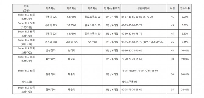 이와 함께 팔란티어·테슬라를 기초자산으로 한 종목형 ELS 3종, 코스피200·니케이225·S&P500·유로스톡스50을 기초자산으로 한 지수형 ELS 4종도 선보였다. 월지급형과 리자드형 등 다양한 구조로 구성됐으며, 최소 가입금액은 10만원이다. 청약 마감일은 오는 9월 12일 정오까지다.