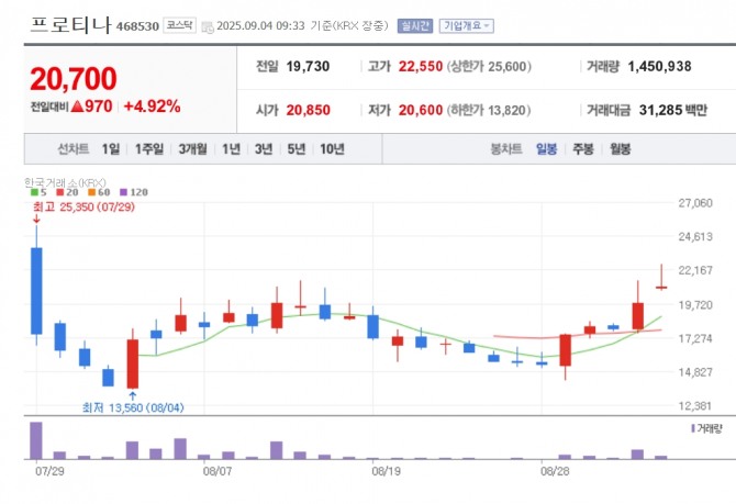 이미지 확대보기4일 한국거래소에 따르면 오전 9시33분 프로티나는 전일 대비 4.92% 오른 2만700원에 거래되고 있다.