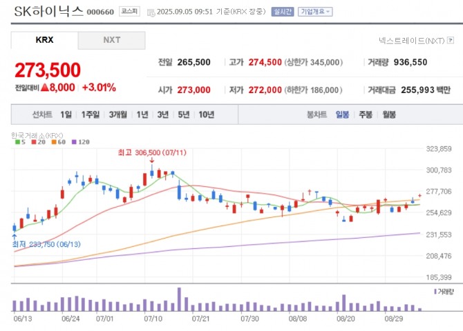 이미지 확대보기5일 한국거래소에 따르면 유가증권시장에서 SK하이닉스는 오전 9시 51분 현재 전 거래일보다 3.01% 오른 27만3500원에 거래되고 있다.