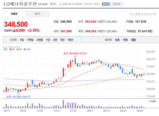 이미지 확대보기11일 한국거래소에 따르면 이날 오전 9시 58분 현재 LG에너지솔루션 주가는 전 거래일 대비 2.35% 오른 34만8500원에 거래되고 있다.