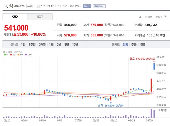 이미지 확대보기12일 한국거래소에 따르면 오전 10시 12분 기준 농심은 전 거래일 대비 10.86% 오른 54만 1000원에 거래되고 있다. 농심홀딩스도 6.65% 오른 8만 9800원에 거래 중이다.