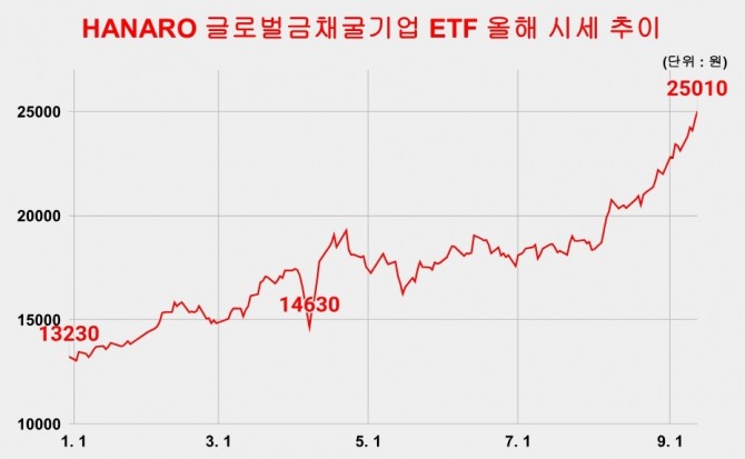 김승철 NH-Amundi ETF투자본부장은 "금값 강세 국면에서 채굴기업은 직접 금 투자보다 높은 수익을 기대할 수 있다"며 "ETF를 통해 글로벌 금광업체에 분산 투자하는 효과를 누릴 수 있다"고 강조했다.