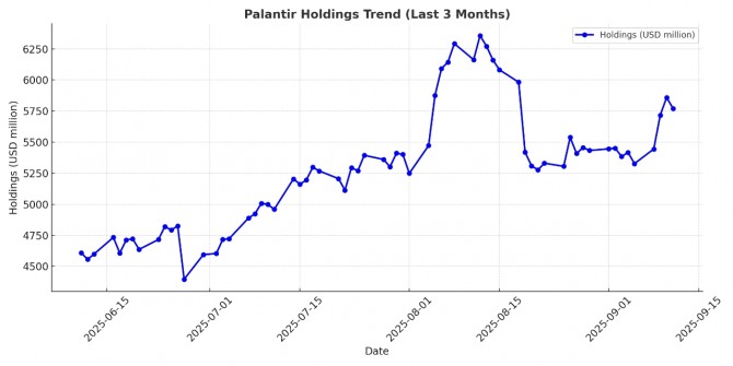 글로벌이코노믹이 자체 집계한 최근 3개월간 일자별 보관액 추이를 보면, 6월 11일 46억 달러 수준이던 팔란티어 보관액은 7월 들어 50억 달러를 넘었고, 8월 5일에는 58억7000만 달러, 8월 12일에는 63억5000만 달러까지 확대됐다. 불과 석 달 새 보관액이 12억 달러 가까이 늘어난 셈이다.