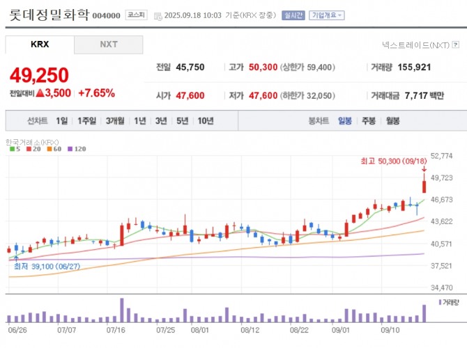 18일 한국거래소에 따르면 오전 10시 03분 기준 롯데정밀화학은 전 거래일보다 7.65% 오른 4만9250원에 거래되고 있다.