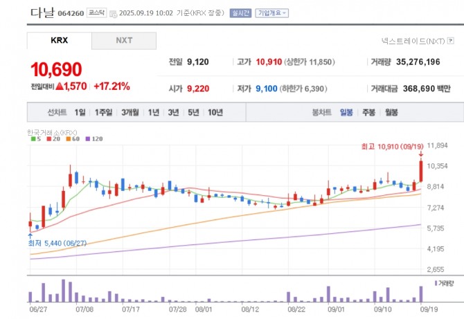 이미지 확대보기19일 한국거래소에 따르면 다날은 오전 10시 02분 기준 전 거래일 대비 17.21% 오른 1만690원에 거래되고 있다.