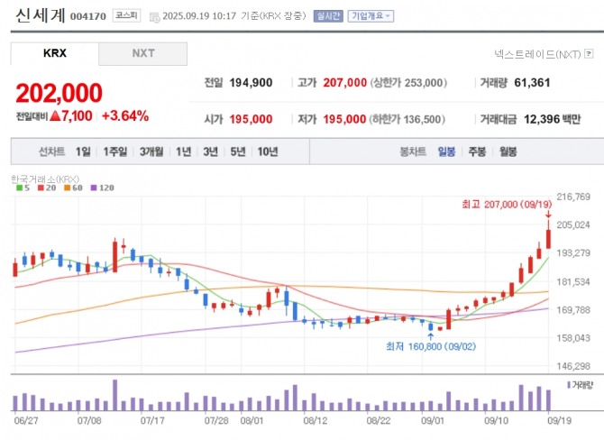 이미지 확대보기19일 한국거래소는 오전 10시17분 현재 신세계는 전일 대비 3.64% 오른 20만2000원에 거래되고 있다. 장중 20만7000원까지 오르며 52주 신고가를 다시 썼다.