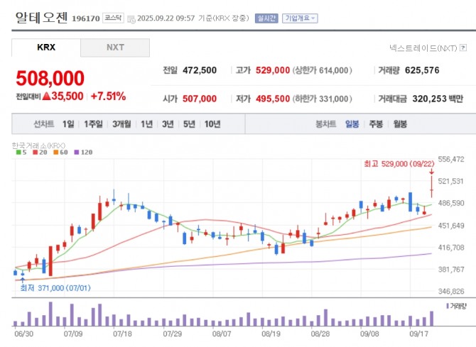 이미지 확대보기22일 한국거래소에 따르면 오전 9시 57분 기준 알테오젠은 전 거래일 대비 7.51% 오른 50만8000원에 거래 중이다. 장중 52만9000원을 터치하며 52주 신고가를 기록했다.
