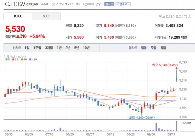 이미지 확대보기22일 한국거래소에 따르면 오전 9시 22분 코스피 시장에서 CJ CGV는 전 거래일 대비 5.94% 오른 5530원에 거래 중이다. 장중 한때 5840원에 거래되기도 했다.