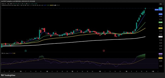 이미지 확대보기23일(현지시각) 뉴욕증권거래소에서 아이온큐의 주가는 전 거래일 대비 4.45% 오른 75.14달러로 장을 마감했다. 이는 최근 발표된 핵심 기술 진전 소식에 따른 것으로 풀이된다.