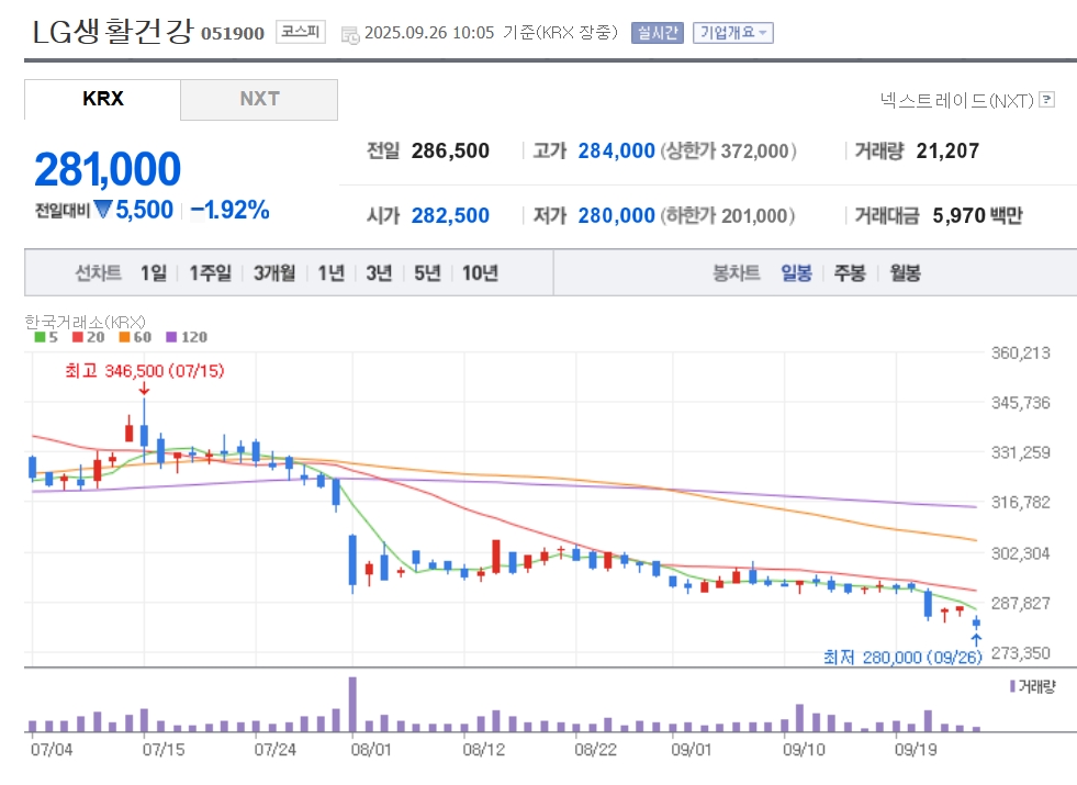 26일 한국거래소에 따르면 이날 오전 10시 05분 현재 LG생활건강은 전 거래일 대비 1.92% 빠진 28만1000원에 거래되고 있다. 장중 한때는 28만원까지 하락하며 52주 신저가를 기록했다.