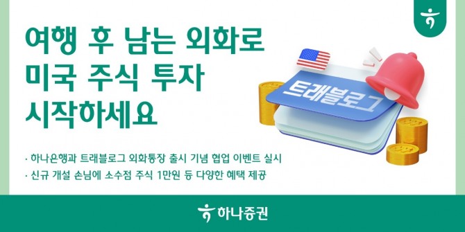하나증권은 이번 이벤트를 통해 10월 말까지 ‘트래블로그 외화통장’을 개설한 손님에게 테슬라, 애플, 엔비디아, 인텔 등 4종목 가운데 2종목을 각 5000원씩, 총 1만원 상당의 소수점 주식을 제공한다. 또한 신규 계좌 개설 손님 중 선착순 1만명에게는 현금 2달러를 추가로 지급한다. 이밖에 하나증권 최초 계좌 개설 손님에게는 6개월간 미국 주식 매매수수료를 면제해주는 혜택도 주어진다.