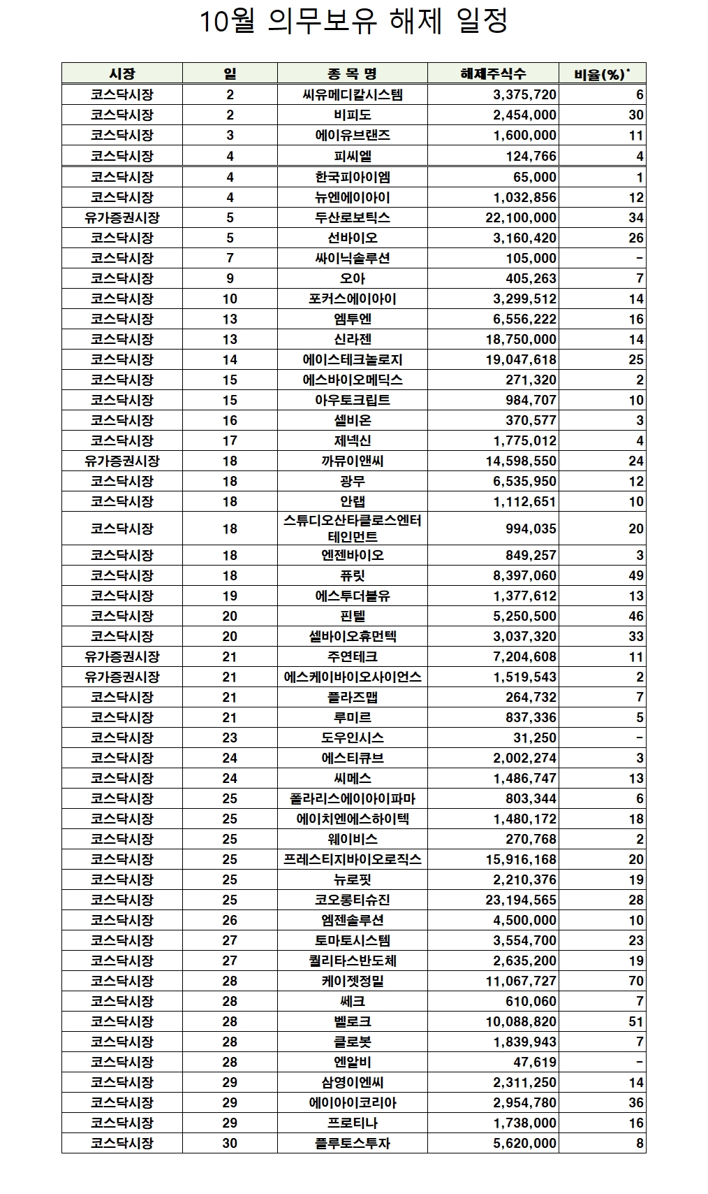 한국예탁결제원은 30일 "10월 중 총 52개사, 2억3182만주의 의무보유등록이 해제될 예정"이라고 밝혔다.