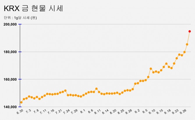 이미지 확대보기30일 한국거래소(KRX) 금시장에 따르면 금 현물은 전일 대비 9,460원(+5.10%) 오른 1g당 194,850원에 거래를 마쳤다.