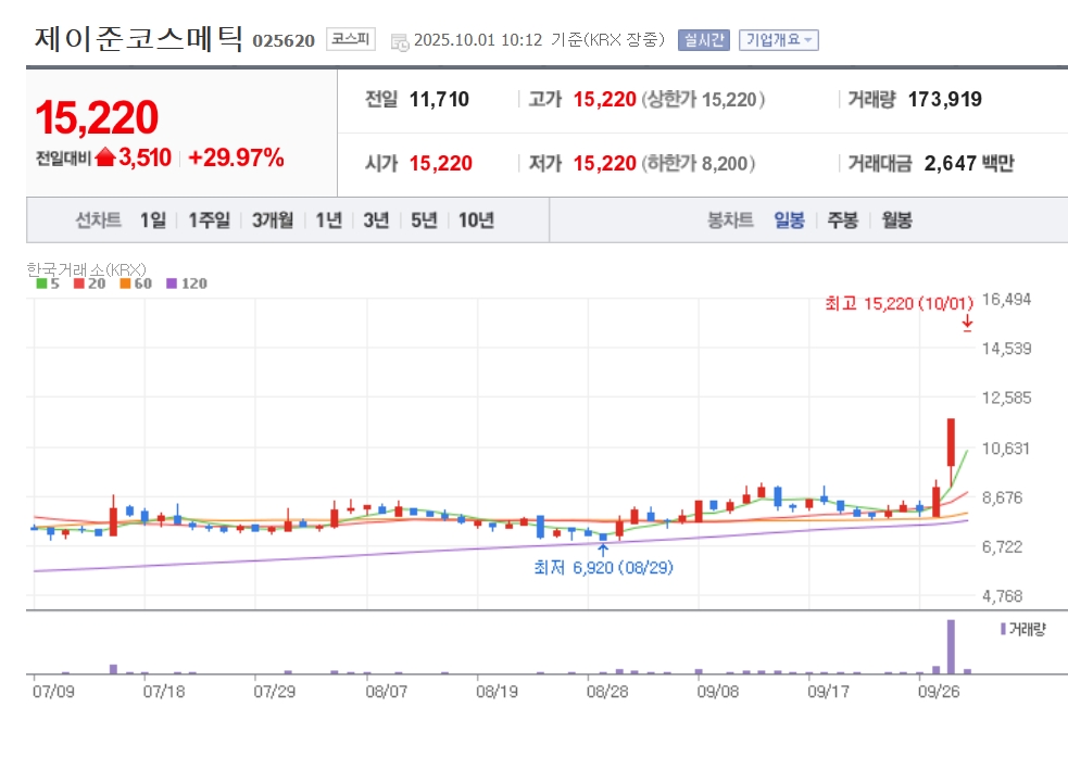 1일 한국거래소에 따르면, 오전 10시 12분 기준 제이준코스메틱은 전 거래일 대비 29.97% 오른 1만5220원에 거래되고 있다. 이 종목은 전일 1만1710원으로 상한가를 기록한데 이어 이날도 상한가를 기록하는 중이다.